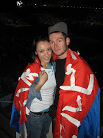 A onda je došao bolji dio večeri jer su igrali Rusija-Japan. Svi Slaveni su navijali za Slavene, prvo svi za Ruse (dvorana je bila puna Poljaka, Rusa, pedesetak Bugara i nešto Srba), a onda svi za Poljake protiv Brazila u finalu. Nije da je Poljacima nešto pomoglo, Brazil je stvarno prejak. Bio je tu negdje i Srpska zastava na kojoj je pisalo "Blok70", i naletim na ekipu koja je to nosila. Meni redari nisu dali za vrijeme utakmice da prođem do te ekipe, ali sretnemo se na galeriji (Igore, izgubio sam ti vizitku, javi se na blog pa da se čujemo).